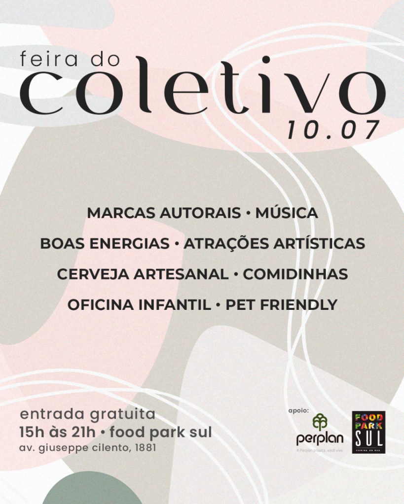 No próximo domingo, a Cão Vivência vai participar da Feira Coletivo, no Food Park Sul. O evento é gratuito e conta com exposição de empreendedores locais como a gente (dos mais variados segmentos), além de atrações musicais, oficina para a criançada, cerveja e comidinhas. Nós vamos expor nosso Tapete de Lamber e dar muitas dicas de treinos para fazer brincando!