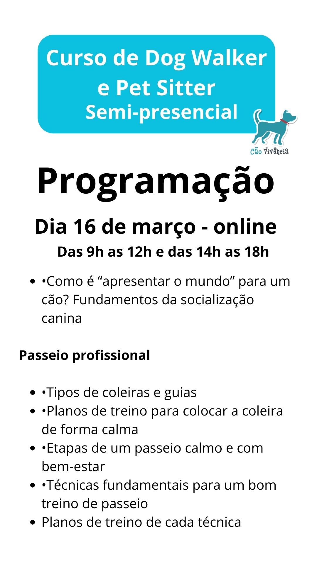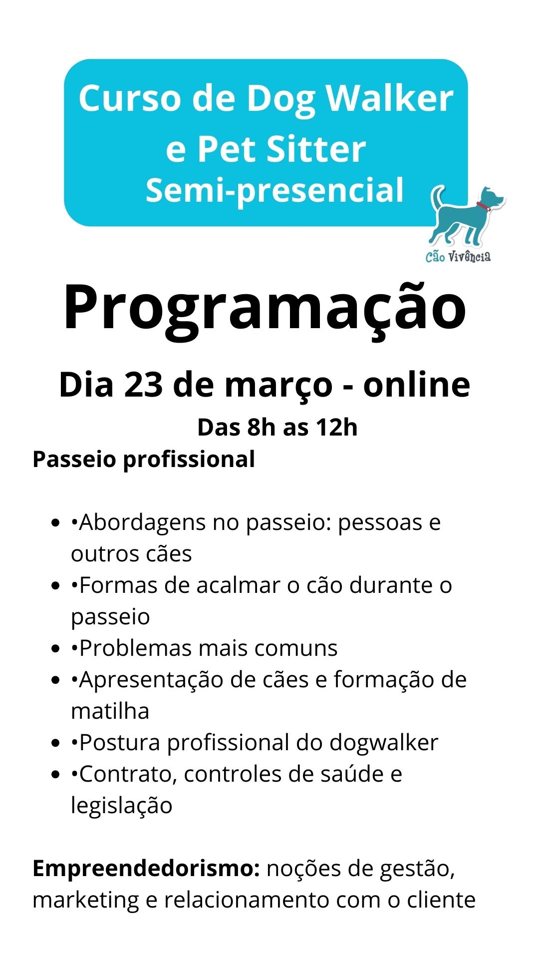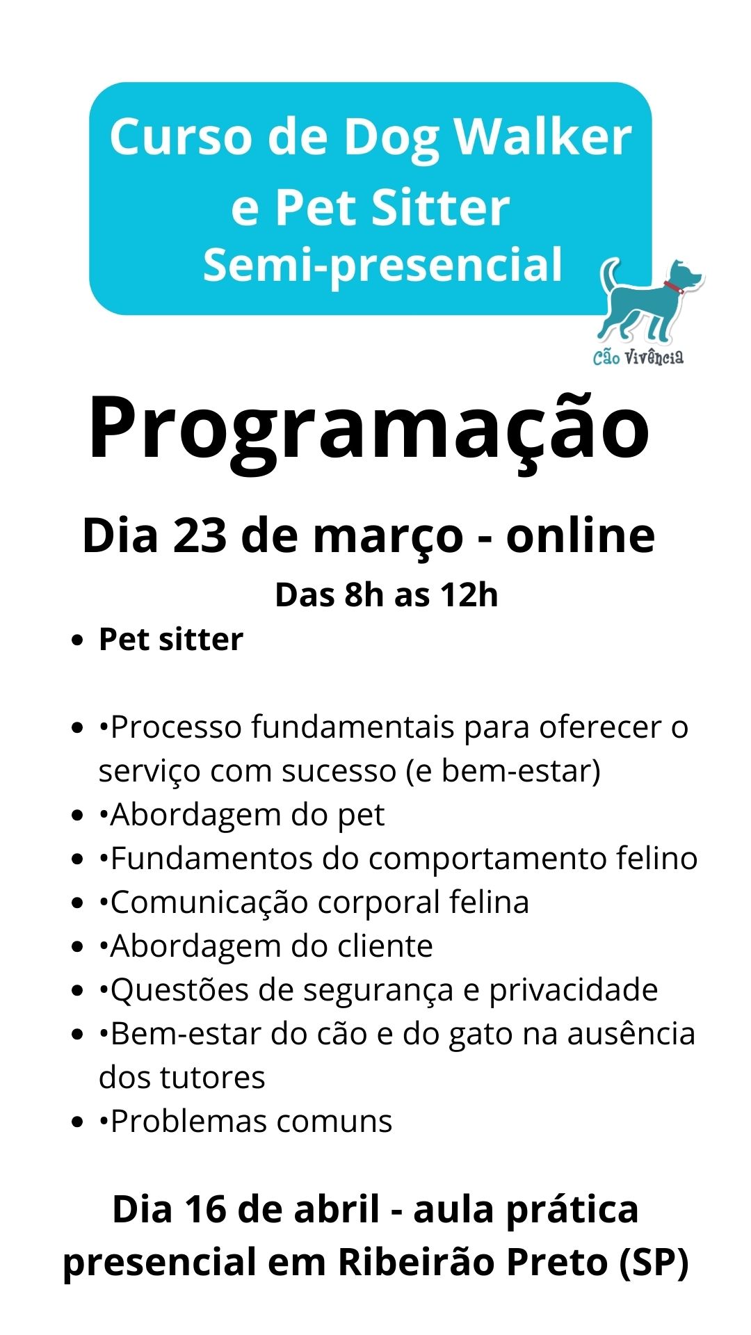 CURSO SEMI-PRESENCIAL DE DOG WALKER (PASSEADOR DE CÃES) e PET SITTER (BABÁ DURANTE VIAGENS)